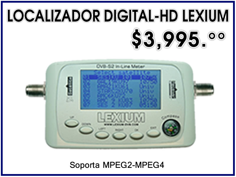 Este es el NUEVO LOCALIZADOR DIGITAL HD LEXIUM ® 6100Mini; No dejes que el "Mini" te engañe, este es un potente localizador que soporta DVB-S/DVB-S2 (alta definición), MPEG2 y MPEG4, ya que es digital y se puede programar las frecuencias del LNB / LNBF junto con su frecuencia del transpondedor, que son capaces de verificar la recepción de señal 100% todo el tiempo, la pantalla es muy fácil de ver, incluso con luz solar directa como ningún otro mini-localizador de satélite en el mercado.