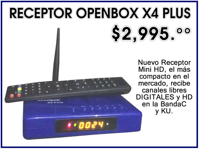 Descripción: El nuevo Receptor OPENBOX X4 PLUS Mini HD con wifi vía USB y función 3G, soporta Cccam, Newcamd, Mgcamd, PowerVu, Biss, Tandberg, Director con autorroll. Con dos puertos de USB WIFI y almacenamiento, todas las funciones de un sistema completo pero con un tamaño compacto y con menor precio. Este equipo es ideal para antenas de la RED EDUSAT (www.edusat.com.mx), Mayor procesador y memoria Ram que el modelo anterior, panel Frontal con 6 botones para controlar sin necesidad del control remoto, menú mucho más amigable, que el anterior Openbox X5, soporta listas IPTV directo, Apps YouTube, You Porn, entre otras muchas más.